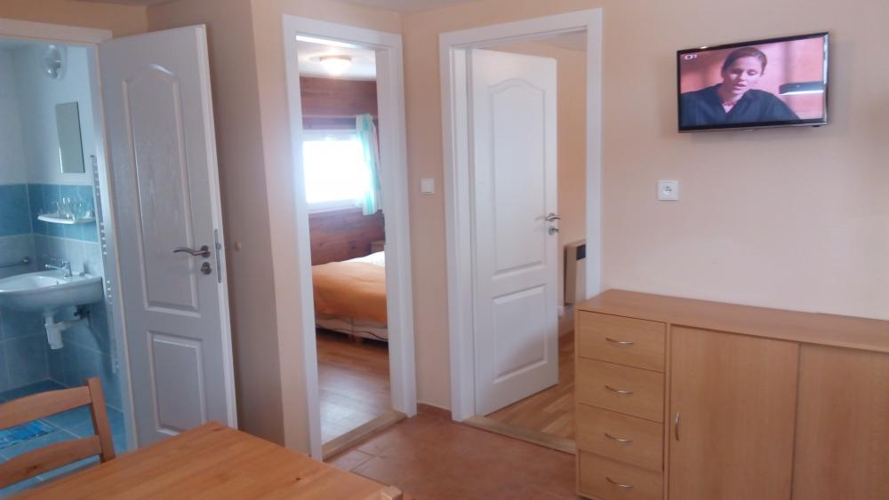 Nově zrekonstruovaný apartmánový domek s dvěmi ložnicemi po 2 lůžkách. Součástí je také místnost se stolem, televizí a lednicí, samostatná koupelna se sprchovým koutem. K dispozici je také venkovní posezení na terase. Domek je celoročně vytápěný elektrickými přímotopy.
